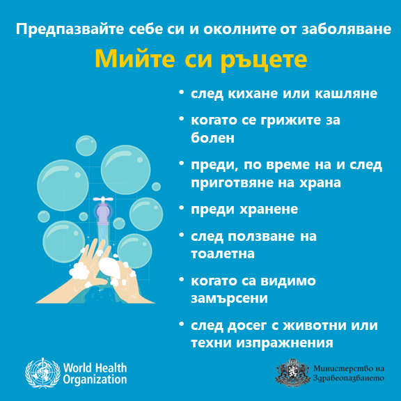 Миенето и дезинфекцията на ръцете са ключът към предотвратяване на инфекция. Трябва да миете ръцете си често и обилно със сапун и вода за най-малко 20 секунди. Ако сапун и вода не са налични, можете да използвате и дезинфекциращ препарат за ръце на алкохолна основа с поне 60% алкохол. Вирусът навлиза в тялото ви през очите, носа и устата, така че избягвайте да ги докосвате с немити ръце.