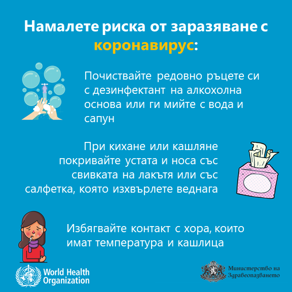Министерство на здравеопазването публикува информация и препоръки за относно новия коронавирус – 2019-nCov. На 11 февруари Министерството откри информационна телефонна линия, на която граждани и организации могат да задават своите въпроси относно епидемията с коронавирус 2019-nCoV. На телефонен номер 02 807 87 57, от понеделник до петък, в рамките на работното време (от 8.30 до 17 часа), информация можете да получите от лекар-епидемиолог.