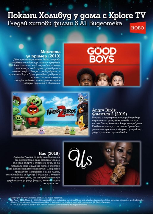 Топ филмови продукции са на фокус през февруари в А1 Видеотека, която е на разположение за абонатите на новата интерактивна телевизия А1 Xplore TV. Едни от по-интересните заглавия включват „Момчета за пример“, „Енгри Бърдс: Филмът 2” и „Нас”. Абонатите на Xplore TV ще имат достъп и до част от номинираните за Оскар филми, съобщиха от А1.