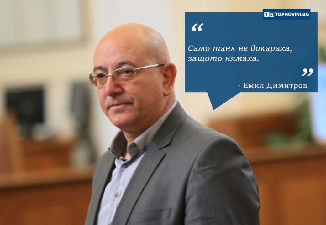 Браво на икономическа полиция, браво, че там имаше въоръжени мъже. Предполагам, че тази жена с химикалката е могла да застреля някого или е била терорист". Така министърът на околната среда и водите Емил Димитров разкритикува акцията в Басейнова дирекция-Пловдив, при която беше задържана директорката на звеното Цветелина Кънева. "Само танк липсваше, ама това понеже не са имали в Пловдив. Тази показност не знам кому беше нужна, но трима директори си подадоха оставките днес".