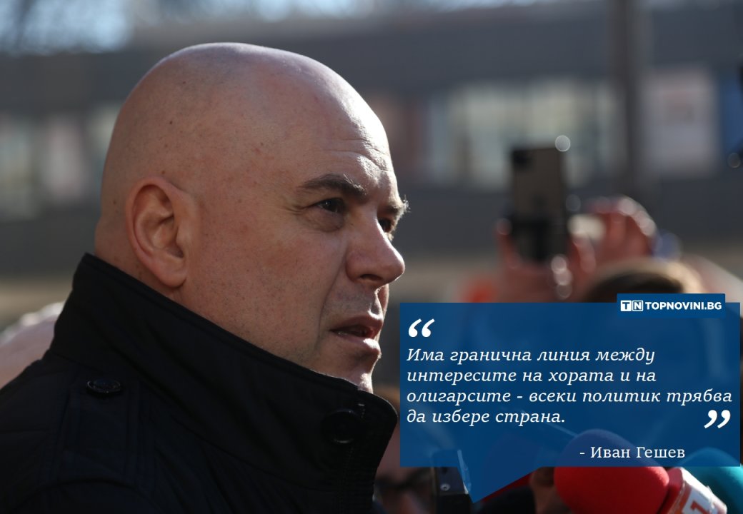 „От тук нататък имаме една гранична линия – от едната страна са интересите на хората, които ние смятаме да защитаваме, от другата страна са престъпниците и олигарсите. А политиците – президент, премиер, депутати, трябва да решат коя страна избират... Аз разбирам, че в момента много хора имат интерес от слаба и неработеща прокуратурата, но съм сигурен, че това не искат хората". Това каза главният прокурор Иван Гешев в Ихтиман, където се провеае спецакция по линия на битовата престъпност.