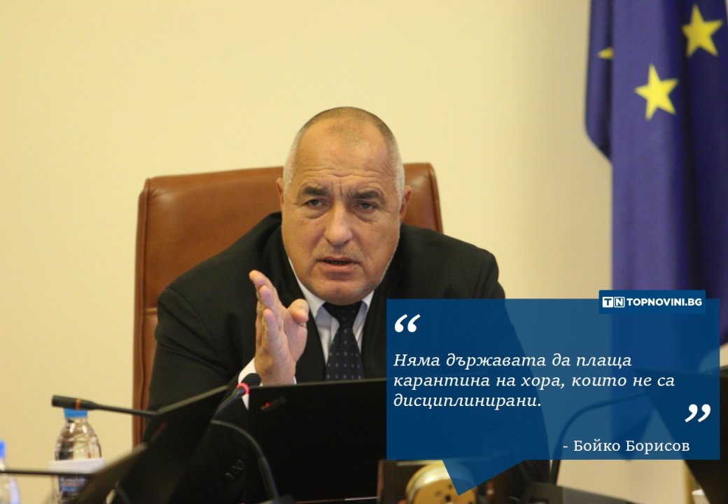 Няма държавата да плаща доброволната карантина на хора, които просто не искат да са дисциплинирани и пътуват. Как да бъде решен проблемът? Личните лекари решават.Сутринта гледах как един казва: „Аз си отивам за Италия, аз си отивам за Франция. Трябва ли след това ние всички да му платим за това, че не иска да е дисциплиниран или не иска да изчака? Държавата – това сме всички ние“. Така премиерът Бойко Борисов коментира ситуацията около предложението за доброволна карантина на хората, които пътуват до страни с разпространение на коронавирус.