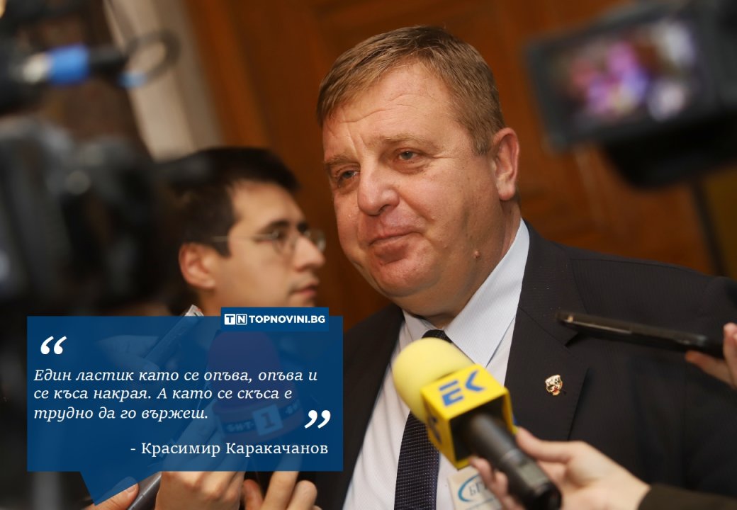 Така повече не може да се продължава, при възникване на каквото и да било обществено напрежение да се удря някой от коалиционните партньори. Какви са тези акции от Цветаново време да пращат качулки с автомати срещу жена с писалка. Ми следващия път да пратя специалните сили с танкове. Нас ни търсят само за работа, а като трябва да си измият ръцете коалиционните партньори са виновни. Един ластик като се опъва, опъва и се къса накрая. А като се скъса е трудно да го вържеш". Така вицепремиерът и лидер на ВМРО Красимир Каракачанов коментира отношенията в коалицията след ареста на шефката на Басейнова дирекция - Пловдив.