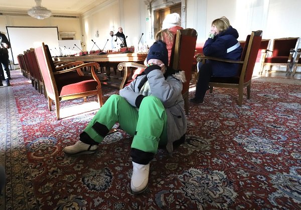 След сутрешната ескалация на напрежението пожарникари докараха специално платнище под прозорците. Това обаче стана повече от половин час, след като се наложи гардовете да се опитват да убедят протестиращите да се приберат обратно в залата и да освободят перваза.