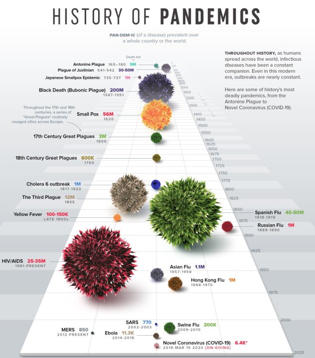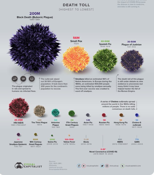 В миналото пандемични вълни от чума, вариола, малария, коремен тиф, проказа, жълта треска и грип са обезлюдявали големи райони и дори отслабвали силите на велики държави. Сайтът visualcapitalist.com публикува инфографики, които проследяват появата на най-големите пандемии, с които човечеството се е сблъсквало и ги съпоставя с обхвата на новия коронавирус. Ето хронологичен списък на най-големите пандемии, с които човечеството се е сблъсквало до момента.