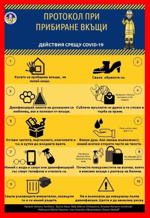 Когато се прибирате вкъщи: не пипайте нищо; свалете обувките; дезинфекцирайте лапите на домашния си любимец, ако е излизал от вкъщи; съблечете връхните дрехи и ги сложете в коша за пране; оставете чантата, портмонето, ключовете в кутия до входната врата; вземете душ; дезинфекцирайте телефона и очилата си; почистете повърхността на всичко внесено с разтвор на белина; свалете ръкавиците, изхвърлете ги и измийте ръцете си.