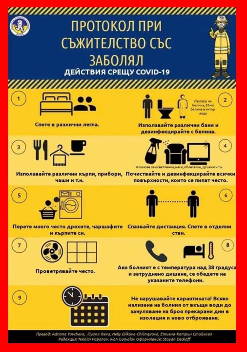 Когато живеете със заболял: спете в различни легла; използвайте различни бани и дезинфекцирайте с белина; използвайте различни кърпи, прибори, чаши и т.н; дезинфекцирайте всички повърхности, които се пипат често; перете много често дрехите, кърпите и чаршафите; спазвайте дистанция; проветрявайте често; ако болният е с температура над 38 градуса и затруднено дишане се обадете на лекар; не нарушавайте карантината- всяко излизане на болния от вкъщи води до зануляване на броя дни в изолация и ново отброяване.