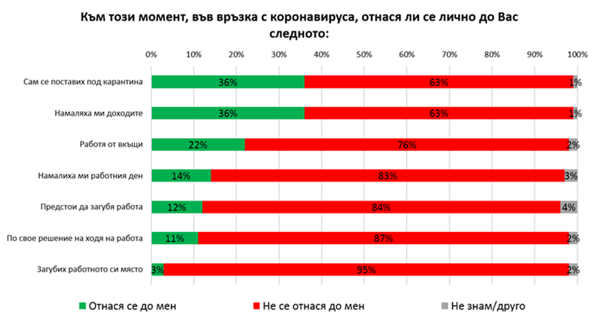 Най-много българи са притеснени, че няма да успеят да платят битовите си сметки - 38%, от невъзможност за покриване на кредитите се опасяват 29%, а 20% смятат, че може да загубят работата си. 3% от анкетираните заявяват, че вече за загубили работа.