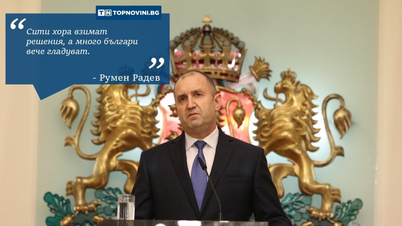 "Дарението има смисъл, когато е навреме и далеч от камерите. Другото е суета и популизъм... Дарението е личен акт, но ако много държите да се равнявате по президента, както разбрах от изказванията, има лесно решение- кръгом и бегом обратно към месец март. Дарете си и мартенските заплати, както направих и аз...Трябва да се помисли не само за физическото, а и за психическото здраве на нацията. Хората, които вземат решенията са сити хора, но много българи вече гладуват." Така президентът Румен Радев отговори на призивите на депутатите да последва примера им и да дари заплатата си.