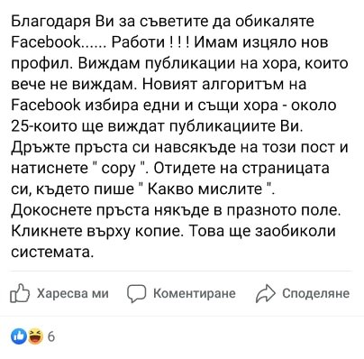 Това не е вярно, a е поредният спам с фалшива информация. Подобни публикации обикновено водят до финансова изгода за първоизточника. От Facebook отново обясниха, че подобен алгоритъм не съществува и нищо не ограничава вашите публикации да достигат до повече хора.