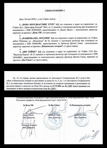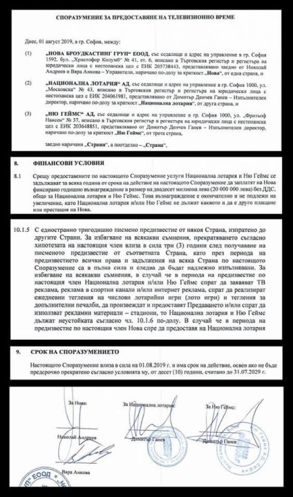По-късно (01.08.2019 г.) част от поставените условия, за да съществува бизнесът ми, бяха оформени в непазарен договор между „Национална лотария“ АД, „Ню геймс“ АД и „Нова броудкастинг груп“ ЕООД за 240 000 000 лева с ДДС.