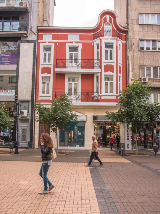 Една класическа сграда, притисната между високите здания на Витошка. В продължение на години червената фасада беше на ръба на разрушението, но надлежното реставриране й върна красотата.
