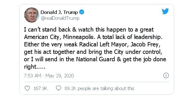 В Туитър президентът Тръмп коментира ситуацията в Минеаполис, където три вечери подред има безредици и сблъсъци с полицията заради смъртта на афроамериканеца Джордж Флойд, който загина по време на полицейски арест.