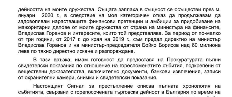 Това пише в сигнала си обвиненият бизнесмен Васил Божков, част от който бе разпространен от "Биволь". Сигналът е изпратен до прокуратурата, президенството и посолствата.