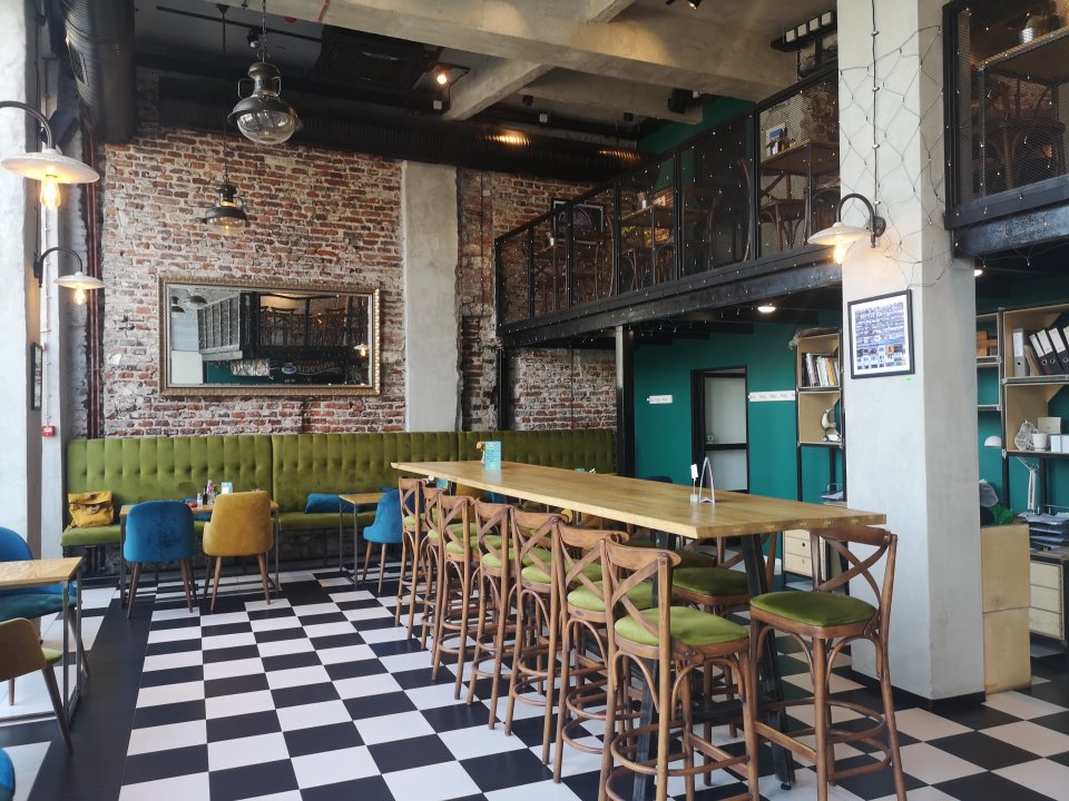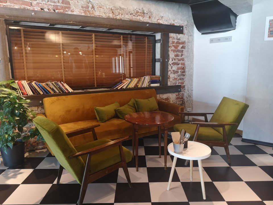 Акцентът в интериора е светлината. „Ние сме едно от малкото – да не кажа единственото заведение в София, което има близо 5 метра витрини и отваря гледка към Лъвов мост. Беше много важно да вкарам светлина в интериора и за да допълня това усещане за уют, използвах цветове, които последната година станаха малко по-популярни. Исках да вкарам усещането все едно си си вкъщи и затова избрах топли цветове и много дърво. Всички мебели са правени по поръчка. Диванът и фотьойлите са автентични. Диванчето го извлякохме от една канцелария в Кремиковци и е на 40+ години, само го претапицирахме. Фотьойлите, правени през 70-те – 80-те години, ги взех от едни много стари офиси – просто седяха в коридора захвърлени. Масичката, скрина и лампата купих от един антиквариат. В общи линии съм се опитал да съчетая двете епохи – миналото и настоящето. Ако погледнете през 20-те години на миналия век – т.нар. Гетсби период, много популярни са били черно-белите плочки на пода. С малката разлика, че съм служил тук-там някаква фигура, за да е по-разчупено. Огледалото, което е закачено на тухлената стена на първия етаж, го намерих в хотела. Сегашните собственици също са го открили тук – никой не знае колко е старо“, посочи Димитър. Осветителните тела също са избирали много внимателно, за да допълнят усещането с меката светлина.