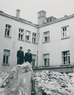 Снимка: Wikipedia / ДА "Архиви" / Инж. Иван Иванов пред разрушената от бомбардировките сграда на Столична община на ул. „Гурко“ в София.