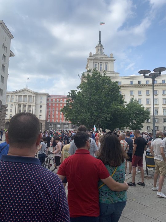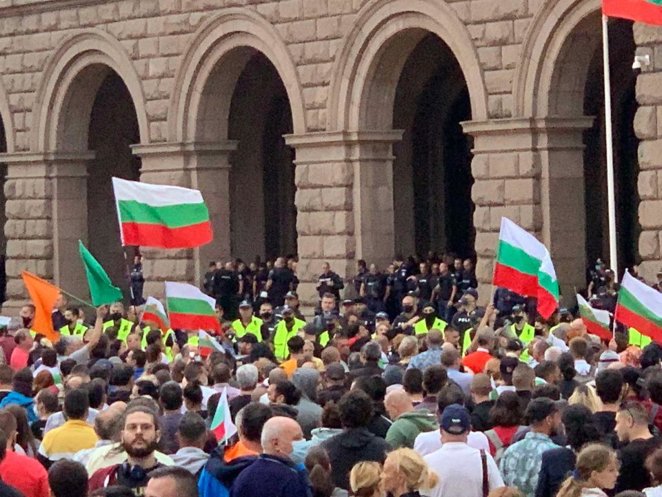 След като обиколиха централните улици, протестиращите отново изпълниха пространството между президентството и Министерски съвет. Полицаите, които охраняват протеста, разпънаха българското знаме пред сградата на правителството.