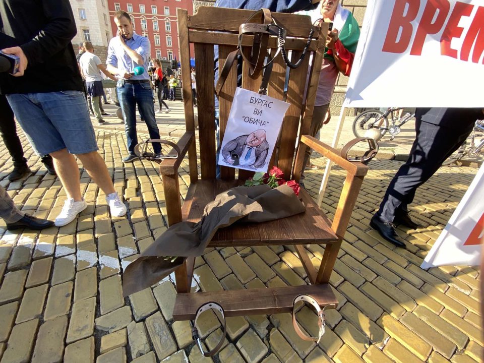 Другата новост днес бе стол от инквизицията, на който бяха поставени цветя и плакат с лика на Бойко Борисов, също поставен на жълтите павета и „спасения“ трибагреник от плажа „Росенец“. Малко преди мръкване между Министерския съвет и президентството пък бе издигнато бесило.