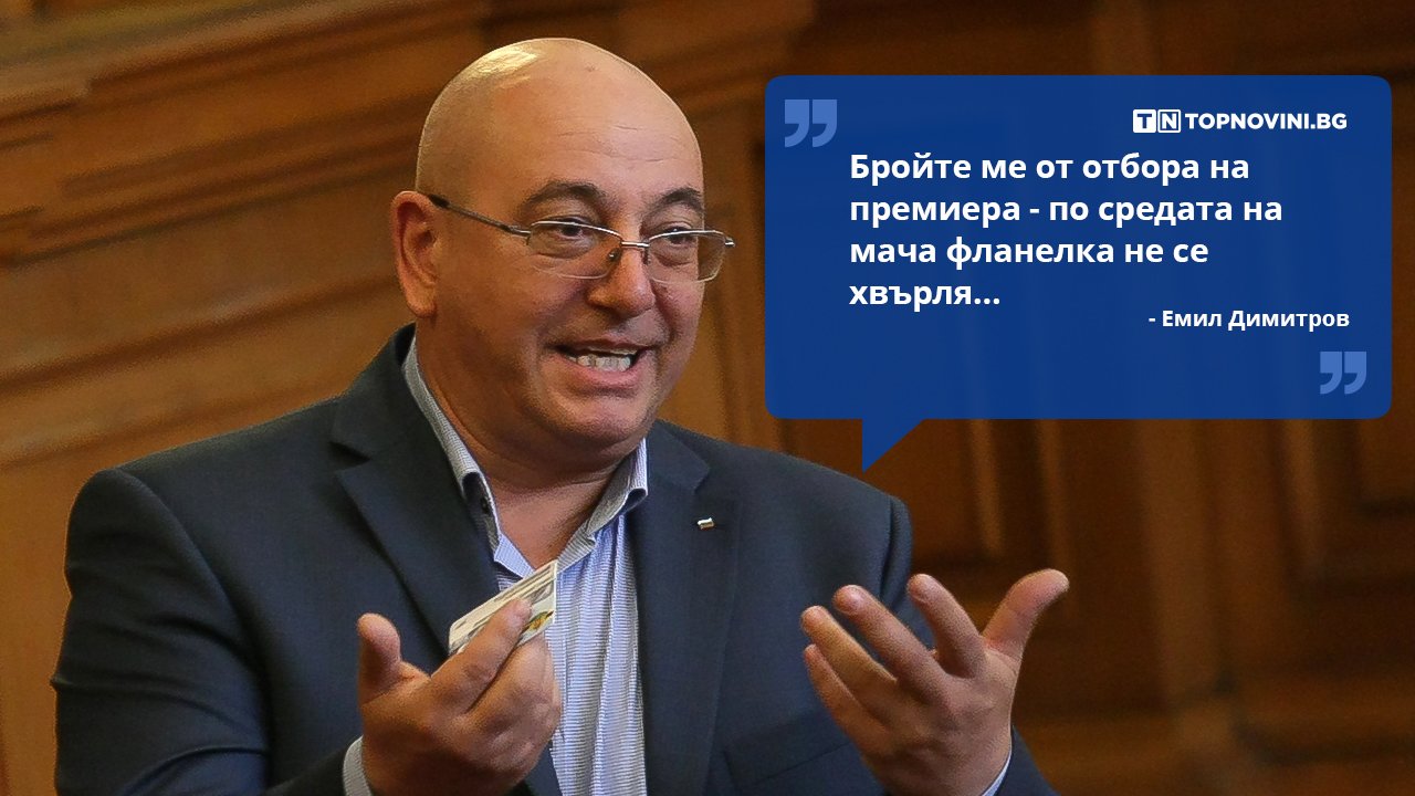 „Бройте ме от отбора на премиера - по средата на мача фланелка не се хвърля“, заяви екоминистърът Емил Димитров- Ревизоро и допълни: „Нямам никакъв проблем с поста на министър, не ме мислете". По думите му, не може да се счупи държавата точно в този момент.
