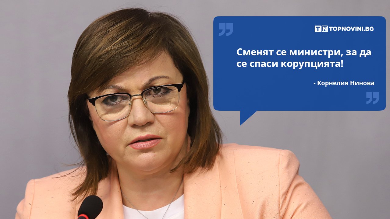 „Сменяте министри при съмнения за корупция, за да спасите корупцията. Предлагате имитация на промяна”. Това коментира лидерът на БСП Корнелия Нинова от парламентарната трибуна по повод предложените кадрови промени в кабинета.