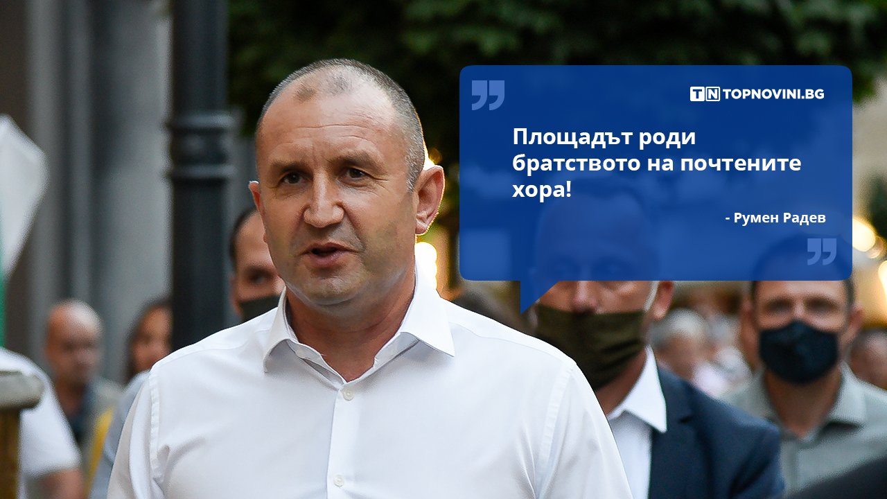„България излезе от психозата и хипнозата на пропагандата и светът отправи поглед към България. Протестът не се поддаде на провокациите. Хората не се уплашиха от обидите, заплахите и репресиите... Никога българите не са били по-единни в решимостта си да отвоюват държавата от мафията. Площадът роди братството на почтените хора, които няма да се предадат, да се поддадат и да робуват на лъжи и заплахи. Които ще отхвърлят всяка обреченост и вярват, че свободна, европейска България на достойните граждани е нашето бъдеще“. Част от речта на президента Румен Радев пред събралите се в петнадесетия ден от протести срещу правителството и главния прокурор.