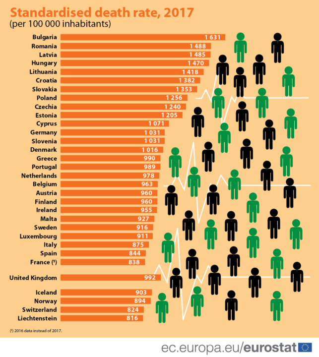 С 1631 смъртни случая на 100 000 души население България е страната от Европейския съюз с най-висока смъртност през 2017 г. Това сочат публикувани днес данни на Евростат.