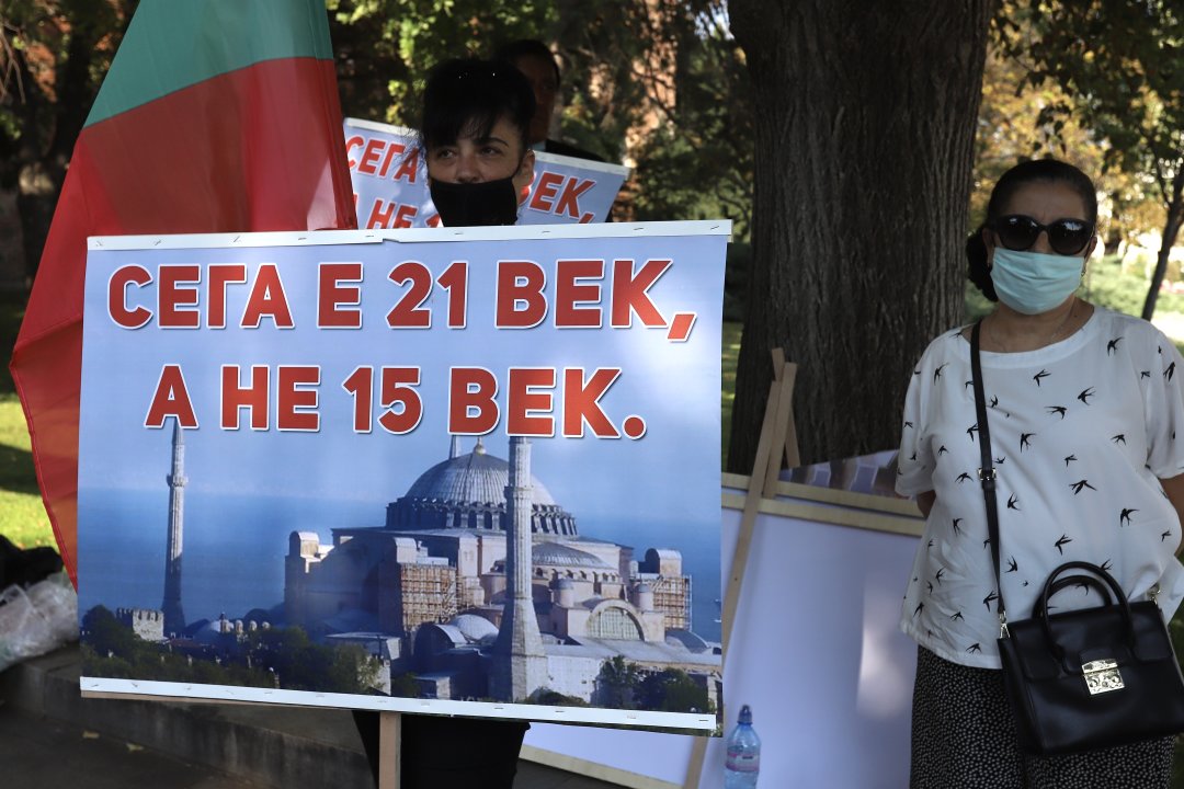 Християни от София излязоха на протест и се обявиха против превръщането на храма „Св. София“ в Истанбул в джамия, където днес се проведе и първа мюсюлманска молитва. Огорчени и обидени от решението на Турция за катедралата граждани се събраха пред столичния храма „Св. София“.