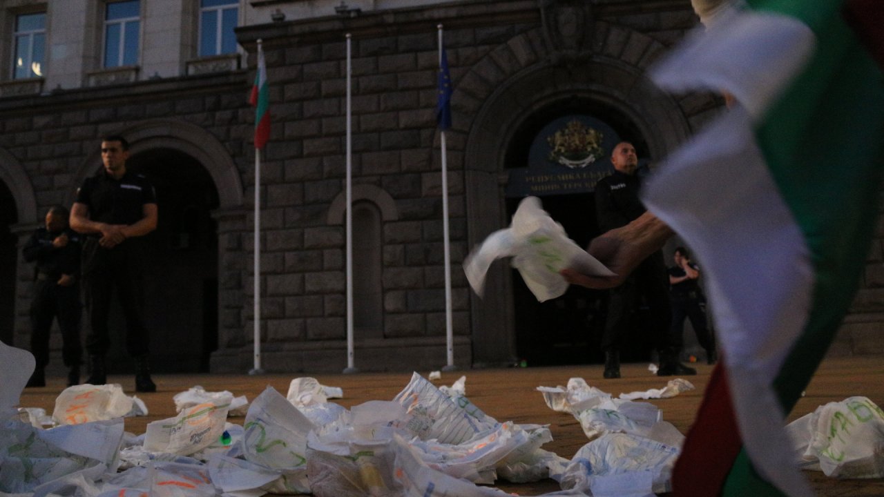 Протестиращите хвърляха памперси с надпис "оставка" по сградата на Министерски съвет. Майките от "Системата ни убива" окачиха пинята във формата на тиква с лика на премиера Бойко Борисов.