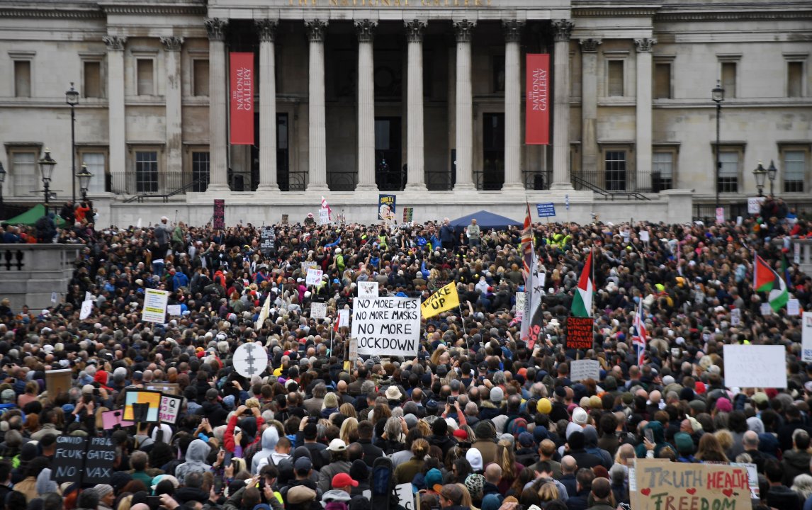 Хиляди протестираха в Лондон срещу новите ограничения. Много от демонстрантите на площад "Трафалгар" не носеха маски.