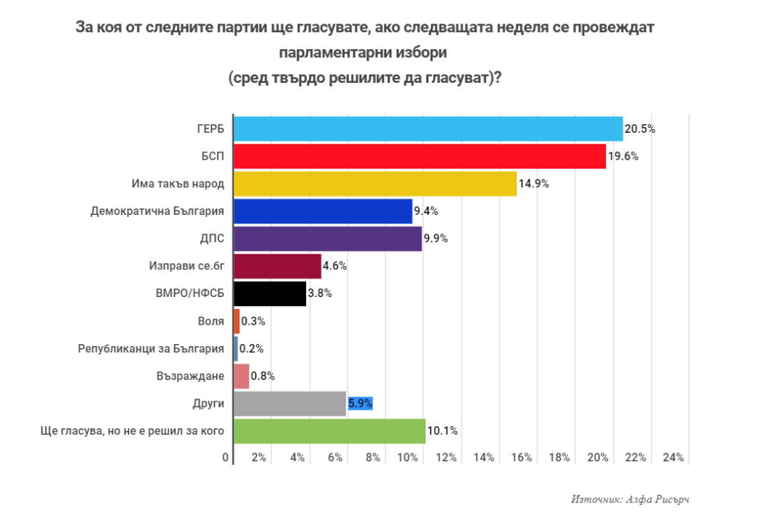 Позициите на ГЕРБ и БСП са равни, като управляващата и водещата опозиционна сила взимат около 20 на сто от гласовете на твърдо решилите да гласуват.