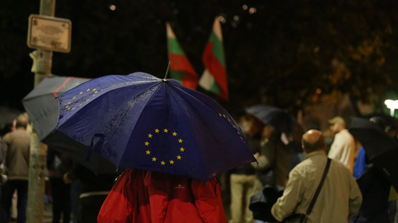 Въпреки дъжда, десетки граждани се събраха при Триъгълника на властта в София.