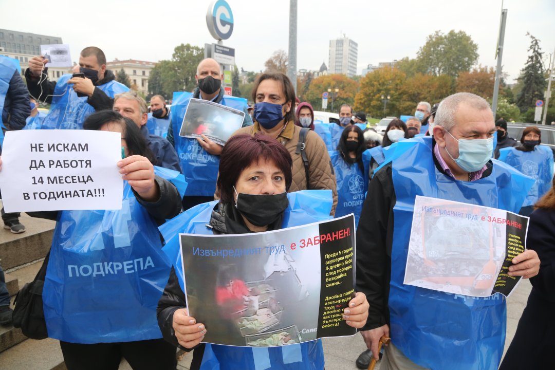 Протестиращи от Конфедерацията на труда „Подкрепа“ се събраха на протест пред парламента, за да изразят недоволството си срещу промените в Кодекса на труда, с които се дава възможност за увеличение на извънредния труд от 150 на 300 часа годишно.