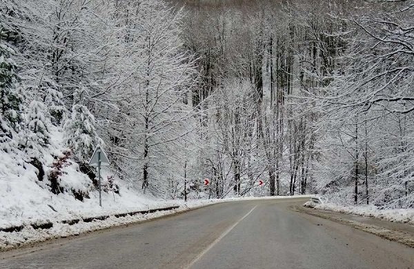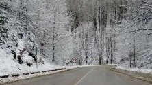 Снежната покривка е около два-три сантиметра и е само във високата част на планината. Пътната настилката е мокра. Една машина е излязла да опесъчава.