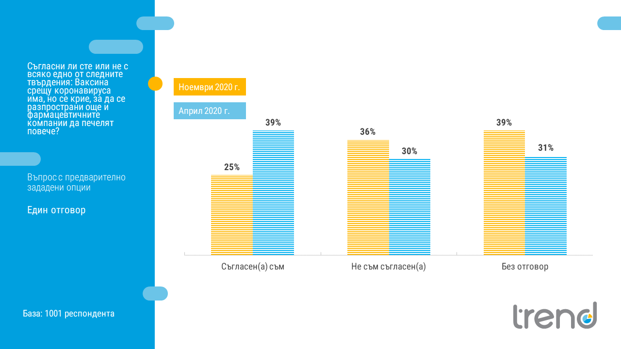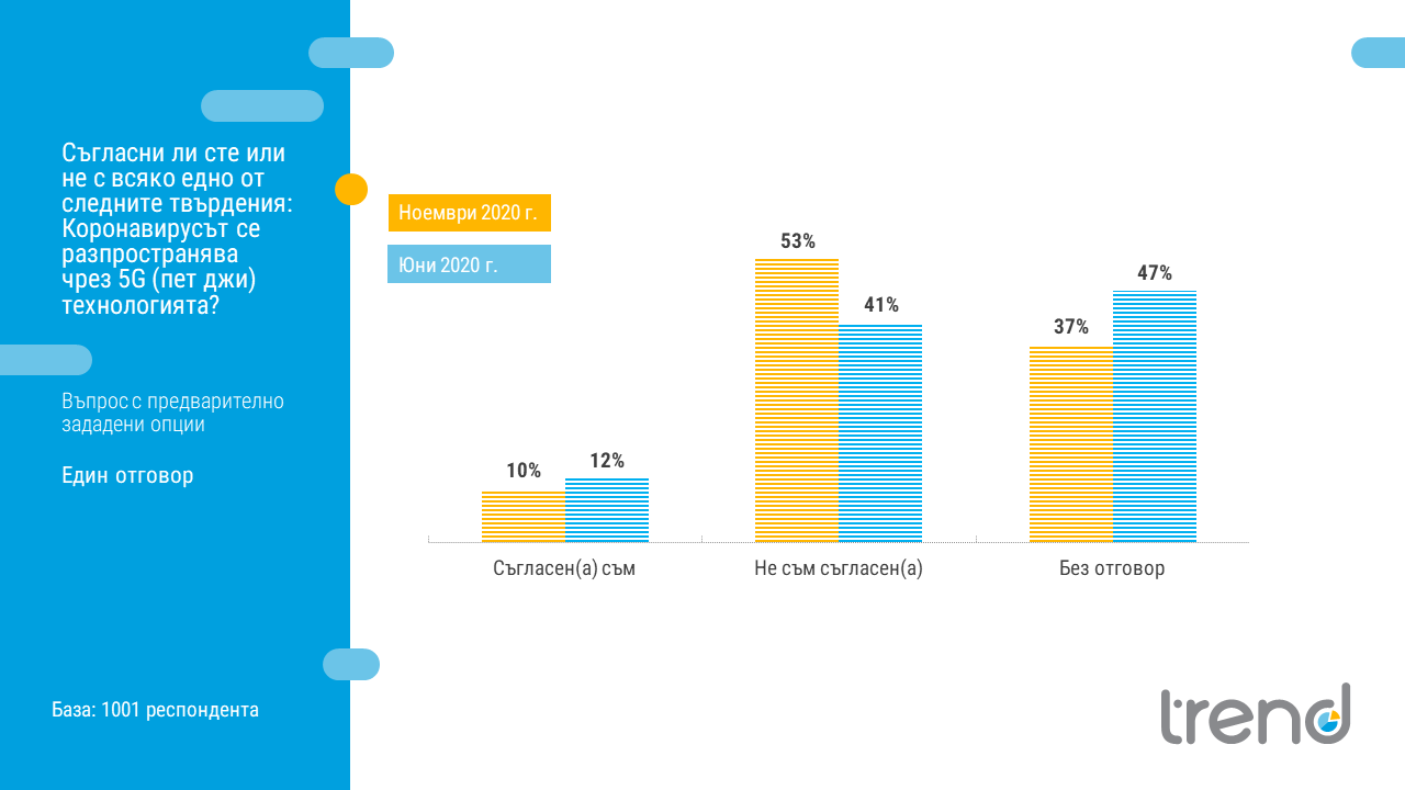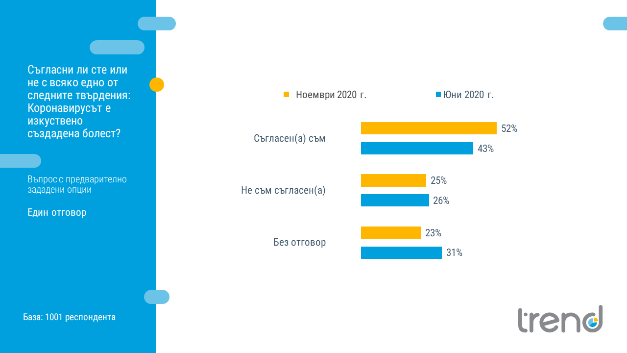 Това показва ново проучване на „Тренд“ по поръчка на вестник „24 часа“, посветено на нагласите на българите спрямо конспиративни теории около COVID-19. Проучването е реализирано в периода между 2-10 ноември 2020 г. чрез интервюта "лице в лице" сред 1001 души на възраст 18+.