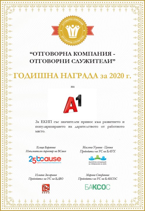 Само седмица след като А1 обяви, че удвоява събраната през 2020-а от дарения по ведомост сума от 40 000 лева, телекомът получи златен Годишен знак „Отговорна компания – отговорни служители“. В съответствие с противоепидемичните мерки, наградата бе обявена на онлайн церемония. Съорганизиратори на инициативата са Фондация BCause, Българското дружество за връзки с обществеността (БДВО), Българската асоциация за управление на хора (БАУХ) и Българската асоциация на КСО специалистите (БАКСОС), съобщиха от пресцентъра на А1.
