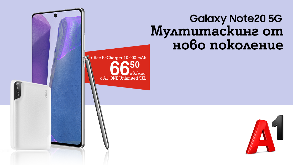 А1 започна продажбите на новата версия на флагмана на Samsung от 2020 година – Galaxy Note20. Смартфонът вече има възможност за поддръжка на 5G мрежата на телекома. Това го превръща в първото устройство на този производител, което идва готово за работа с 5G. Освен с 5G модем, новият Samsung Galaxy Note20 5G идва и в комплект с мощна външна батерия ttec, снабдена със забележителен капацитет от 10 000 mAh. В кутията са още зарядно устройство, както и иконичната писалка S Pen – отличителният аксесоар на цялата серия Note.