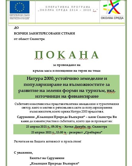 Кръгла маса на тема „Натура 2000“, устойчиво земеделие и популяризиране на възможностите за развитие на зелени форми на туризъм, включително източници на финансиране“ ще се проведе в Силистра.
