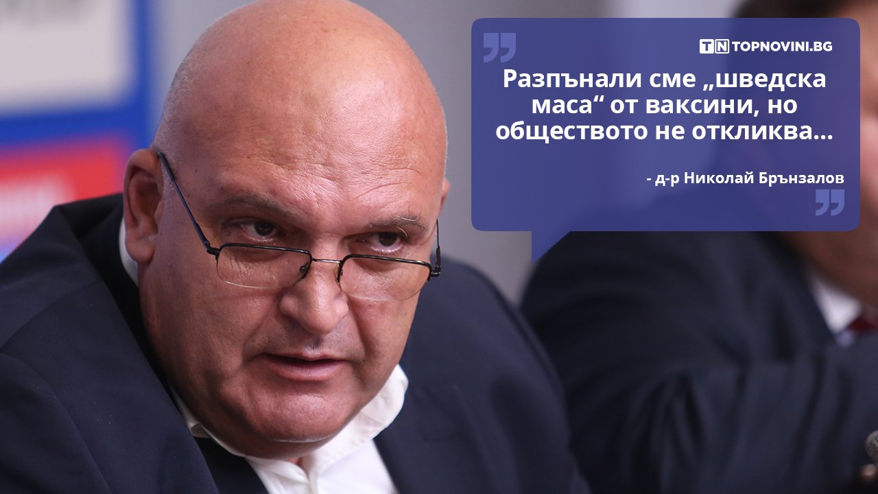 „Ние се къпем във ваксини в момента в България. С шведска маса от ваксини разполагаме. Всеки един българин, когато пожелае – във всеки един ден от седмицата, в който час от денонощието пожелае, където поиска и която ваксина избере, може да си постави. Това е фактът в България – залежали ваксини, пълни складове – населението не откликва“. Това коментира д-р Николай Брънзалов - заместник-председател на УС на БЛС.