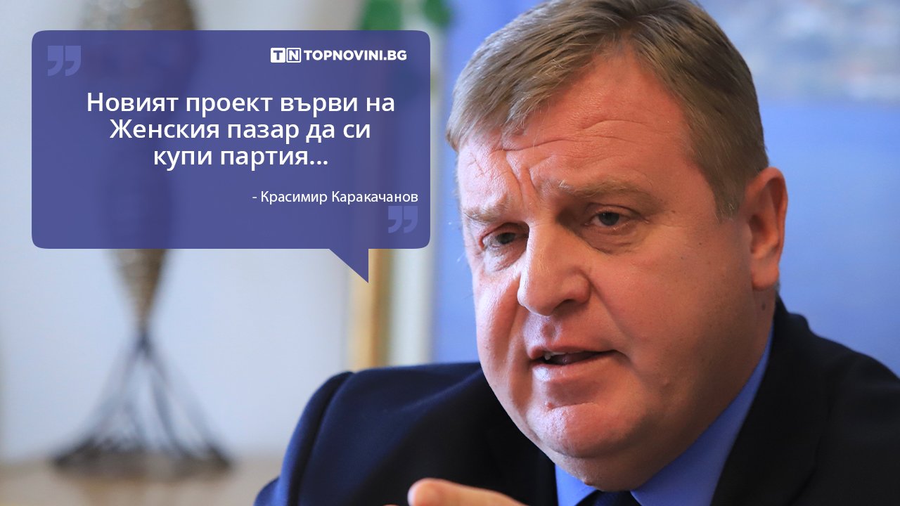 „Новият проект върви на женския пазар да си търси да си купи партия да се яви през нея ама дали ще е „Екогласност“ или друга неизвестно каква е – купуваме си партия, която да е мандатоносител“, категоричен бе Каракачанов, който определи проекта на Петков и Василев като поредния кьорфишек.