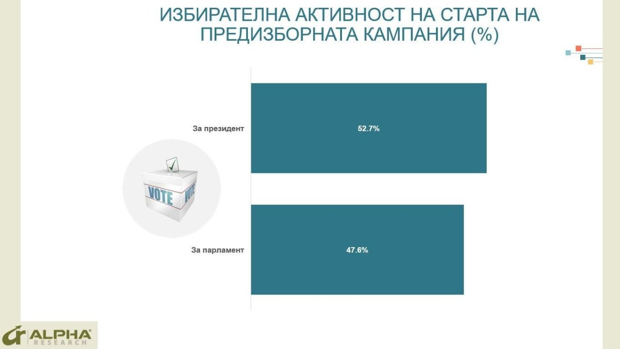 И започващата кампания може да се окаже решаваща за тези гласове. 52.7% от пълнолетните български граждани смятат да гласуват на предстоящите президентски избори, а 47.6% – на извънредните парламентарни. Оправдават се очакванията, че избори две в едно водят до повишаване на избирателната активност, а президентският вот по традиция предизвиква по-голям интерес.