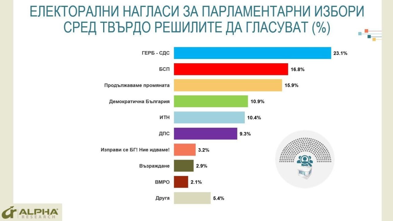 Регулярното проучване на социологическа агенция „Алфа Рисърч“ очертава следното съотношение на силите в парламентарния вот: ГЕРБ стартира от първото място с 23.1% продължава да бъде на устойчива дистанцията пред останалите.