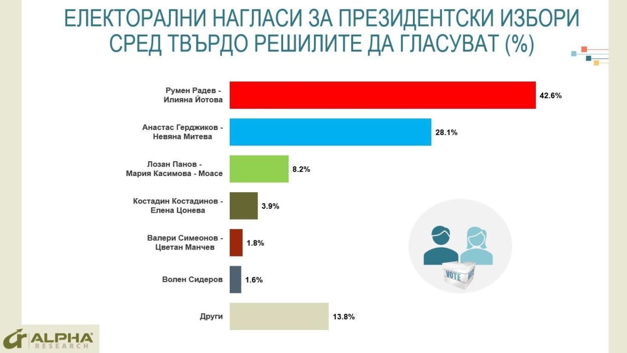 Настоящият президент Румен Радев влиза в надпреварата с 42.6% от вота на твърдо решилите да гласуват. Най-силна е подкрепата, която получава от симпатизантите на БСП (над 90% от тях) и „Изправи се. БГ“ (80%). Малко над две трети от привържениците на ИТН и на „Продължаваме промяната“ също биха дали гласа си за него. След издигането на Лозан Панов, една четвърт от симпатизантите на „Демократична България“ изразяват подкрепа за Радев.