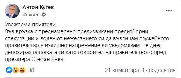 „Във връзка с преднамерено предизвикани предизборни спекулации и воден от нежеланието си да въвличам служебното правителство в излишно напрежение ви уведомявам, че днес депозирах оставката си като говорител на правителството пред премиера Стефан Янев”, написа той.