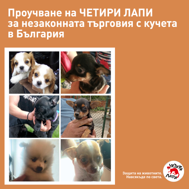 За да провери размера на незаконната търговия, проблемите при продажба на кучета и доколко развъдените и предлагани животни отговарят на българското законодателство, „Четири лапи“ е инициирала собствена проверка в три от най-популярните сайтове за обяви в България. Проучването е показало масово несъответствие със законовите изисквания. Проверките са били извършени по метода „таен клиент“. Проведени са били телефонни разговори и срещи на място с продавачи, пуснали обяви в сайтовете. В периода  май – юни 2021 г., по подбрани на случаен принцип обяви в сайтове, от 15 населени места и 19 различни продавачи, са били реализирани 34 обаждания, от които при 24 е била осъществена и среща за оглед на продаваното кученце.
