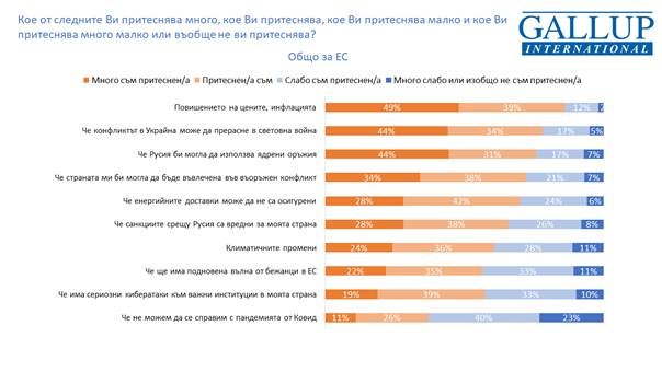 Най-големите притеснения на гражданите на ЕС в момента са повишаващите се цени, страхът от разширяване на конфликта в Украйна и възможният недостиг на енергийни доставки. Проблеми, които бяха в челото на списъка с приоритети преди месец, като пандемията от ковид и климатичните промени, сега за избледнели в своята значимост. Това сочат данни от изследване на „Гапъл Интернешънъл“.