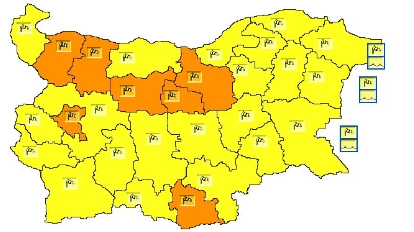Жълт и оранжев код за опасно силен вятър е обявен в цялата страна. На места ще духа силен и временно бурен южен вятър с пориви до 25-30 м/с.