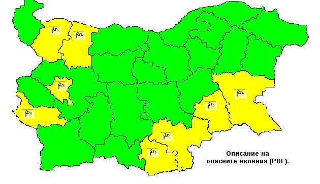 Жълт код за опасно силни ветрове е обявен за седем области в страната. Това са София, Монтана, Враца, Кюстендил, Кърджали, Хасково, Ямбол и Бургас. Там поривите на вятъра ще достигат до 24 м/с.