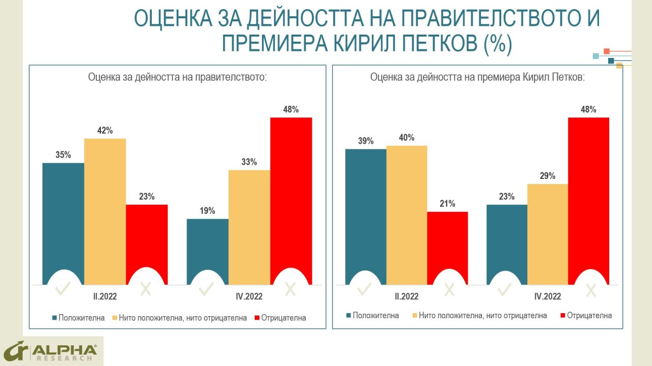 Проучването регистрира спад в одобрението (от 35% на 19%) и рязък скок (от 23% до 48%) в неодобрението за дейността на кабинета „Петков“ за периода февруари - април 2022г. Същата тенденция е налице и в рейтинга на премиера: положителните оценки спадат от 39% на 23%, а отрицателните нарастват от 21% до 48%.