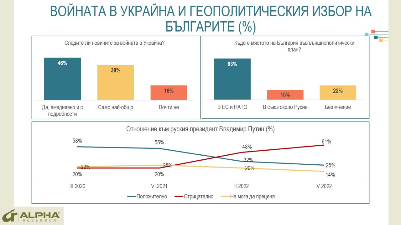 Войната засилва поляризацията по редица теми в българското общество, което се дължи както на увеличената активност на защитниците на Украйна и на действията на Русия в социалните мрежи, така и на покачващия се емоционален градус на напрежение между тях. Продължава ерозията в личния рейтинг на Владимир Путин. След спада до 32 на сто в първите дни на войната, сега доверието в него слиза на 25%, а недоверието скача до 61%. Много от хората, които продължават да харесват Русия, изразяват негативно отношение към президента Путин, което е новост за обществените нагласи в страната.
