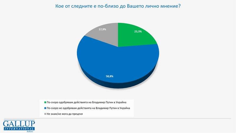 58,8% у нас твърдят, че по-скоро не одобряват действията на Владимир Путин в Украйна. 23,3% обаче не крият, че по-скоро одобряват тези действия. Сред втората група най-вече личат по-възрастни хора, респективно привърженици на политически сили, които са традиционно в по-голяма степен проруски. Това сочи изследване на „Галъп интернешънъл болкан“.